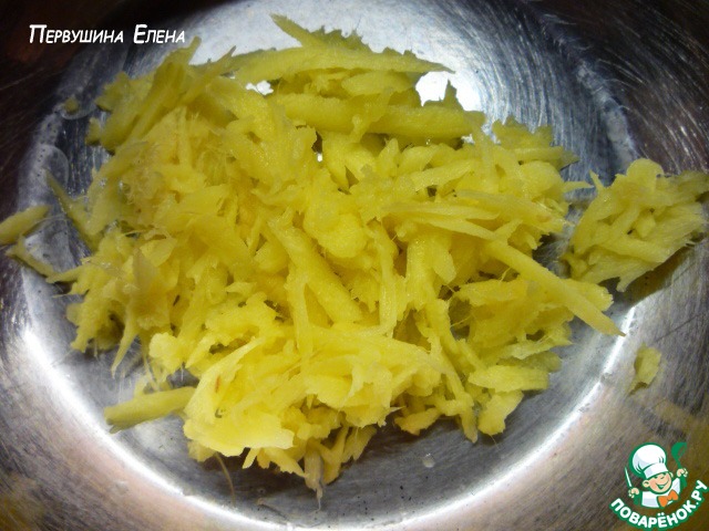 Имбирь натрем на мелкой терке. Кладем в кастрюльку.