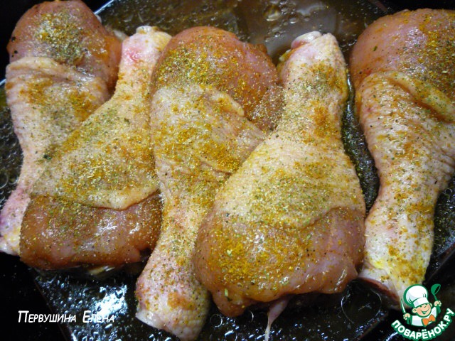 Вынимаем голени в отдельную чашку. Маринад разбавляем водой 1:1. Солим, перчим (я добавила еще соевый соус и джем). Выливаем разбавленный маринад в форму для выпекания. Туда же отправляем мясо. Посыпаем приправами (карри, хмели-сунели, чеснок, перец). И отправляем в разогретую до 180С духовку на 30 минут.
