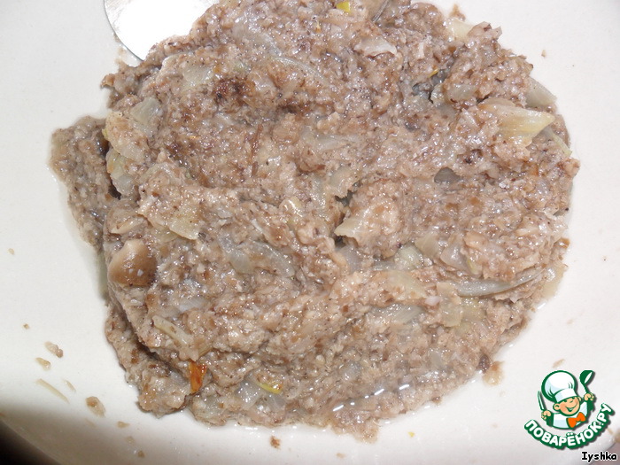 В это время подготавливаем грибы (у меня грибная икра из опят, поэтому подготовка была только в обжарке с луком). Если у вас шампиньоны, то лучше всего их отварить 5 мин. в подсоленной воде, а потом обжарить на масле с луком, посолить, поперчить.