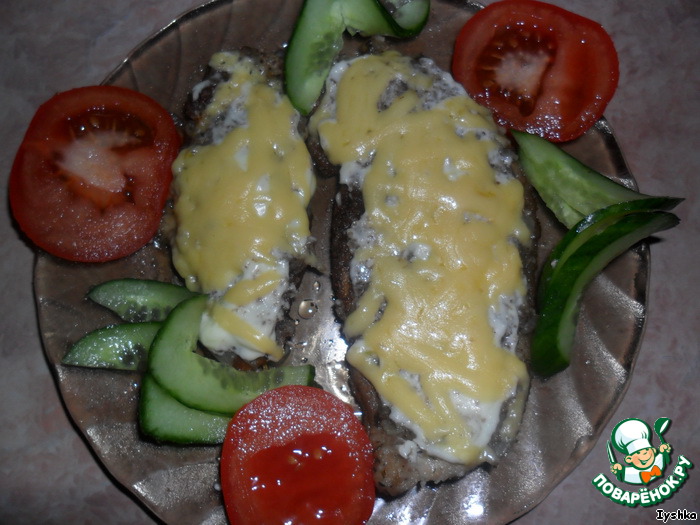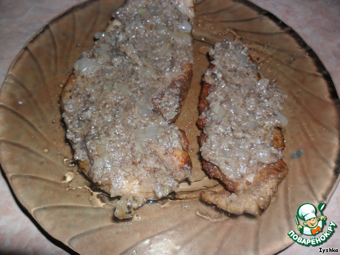 Далее выкладываем на каждое филе грибы, если есть, можно положить еще пару кружков помидора, но я обошлась без него.