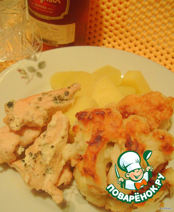 Ароматную, нежнейшую сливочно-мятную куриную грудку подаем с отварным картофелем и цветной капустой в кляре.