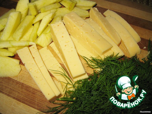 Режем брусочками яблоко и сыр.