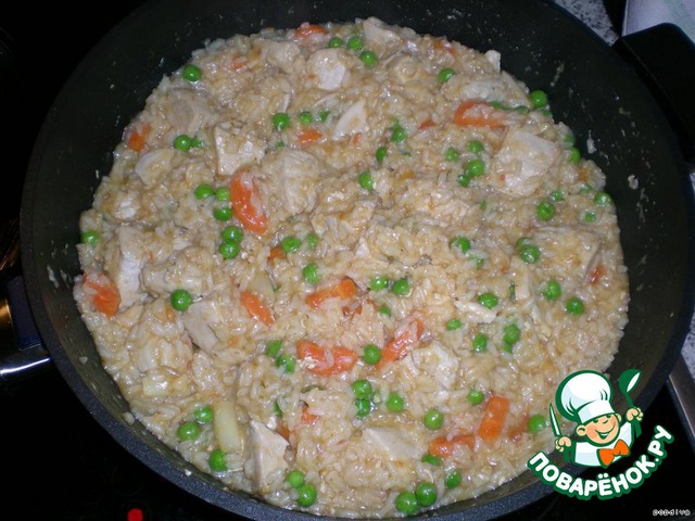 Добавить чеснок, перец, шафран. Попробовать на предмет готовности риса. Перед подачей на стол рекомендуется дать минут 5 настояться, предварительно завернув сковороду в фольгу и полотенце, но муж слопал и без настаиваний! А потом и добавки попросил.