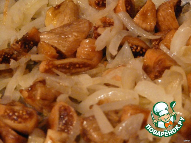 В кастрюльке с толстым дном растопить сливочное масло, добавить лук, обжарить его. Затем инжир, нарезанный на дольки (как тортики).