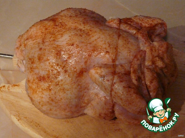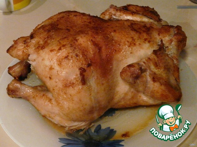 Не забываем поливать курицу выделяющимся жиром, можно поворачивать ее. Готовность определяем по цвету сока, который вытекает при прокалывании толстой части бедрышка: если он розовый, то жарим еще 5-10 минут, а если прозрачный – то все! ГОТОВО!