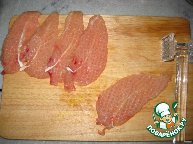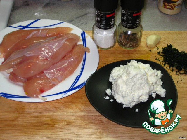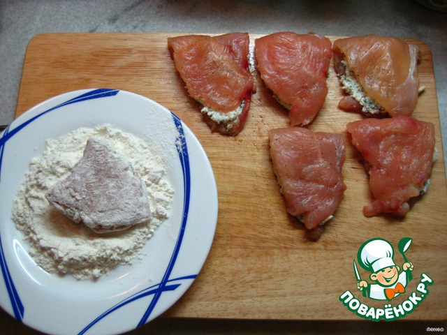 Куриные грудки отбить, посолить и поперчить, но только с одной стороны. Брынза имеет соленый вкус, поэтому внутреннюю сторону не солим.