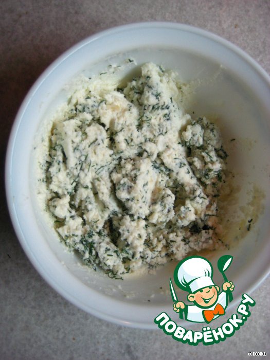 Брынзу подавить вилкой, добавить давленый чеснок и порезанную зелень укропа (в моем случае укроп замороженный, но это не портит вкуса), хорошенько перемешать.