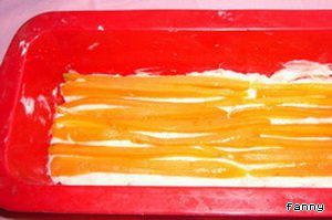Взять длинную форму для выпечки кекса, смазать ее маслом, дно выстелить бумагой для выпечки. Выложить первый слой муслина, разровнять его. Поверх выложить полоски моркови.