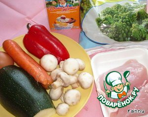 Тем временем подготавливаем овощи для рулета. Морковь, цуккини и перец порезать в длину полосками, шампиньоны вымыть, порезать, подготовить соцветия капусты.
