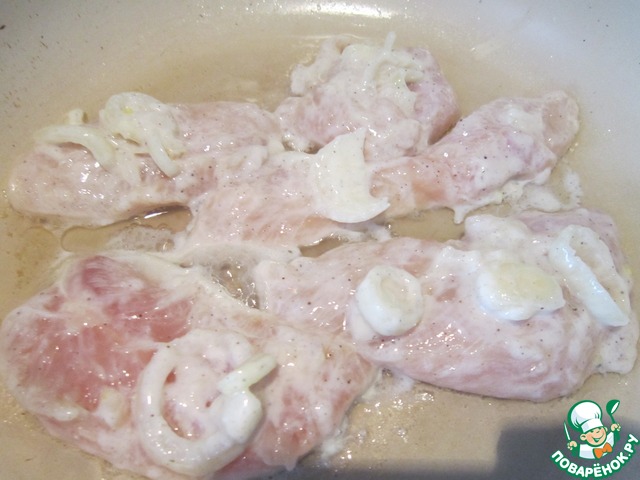 Берем грудку и нарезаем ее пластами примерно 1 см. Режим лук колечками.