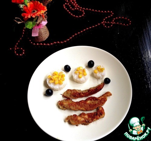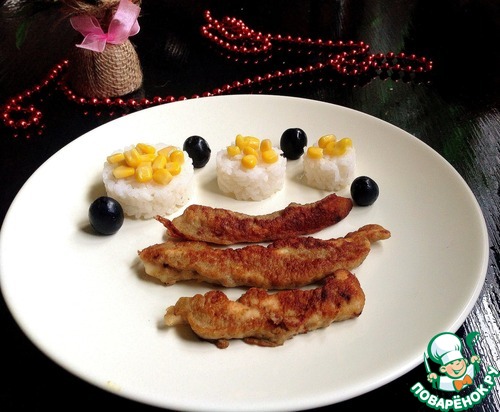 Грудку нарезать тонкими полосками, не толще 2 см. В чашу насыпать муку, в другую выложить грибной соус