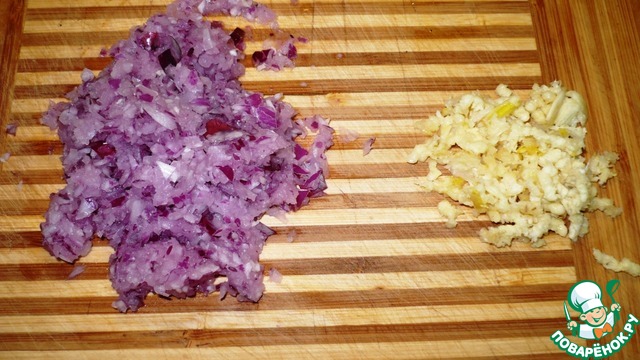 Лук и чеснок почистить. Лук натереть на терке (можно измельчить блендером), чеснок пропустить через пресс.