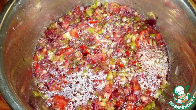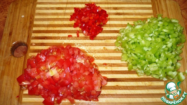 Помидор, сладкий перец и чили, помыть, перцы очистить от перегородок и семян. Мелко нарезать (для перца чили используйте перчатки). Любители поострее могут добавить поболее перца или/и чеснока (а может у меня перец был не очень острый)