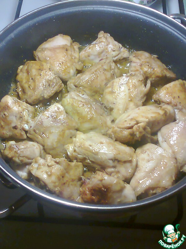 Курицу помыть, нарезать крупно, посыпать специями и слегка обжарить на растительном масле.
