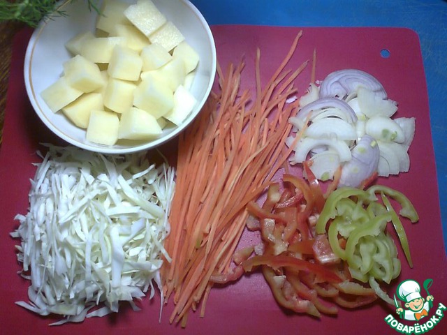 Капусту нашинковать, картофель нарезать кубиками, лук - полукольцами, морковь натереть, как хотите, болгарский перец - соломкой.