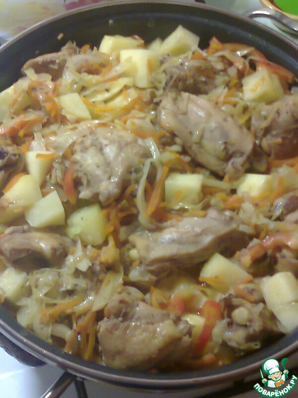 К мясу добавляем лук с морковью, немного бульона (можно просто воды) и тушим 5-6 минут.