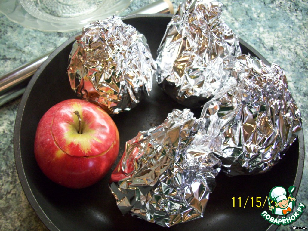 Каждое яблочко оборачиваем фольгой. Думаю, что можно обойтись и без нее, но моя бабушка говорила: «Чем больше ароматов на кухне, тем меньше их в тарелке»… Укладываем в жаропрочную посуду и отправляем в разогретую до 180-200 градусов духовку. (Точнее определить температуру не могу – духовка такая)