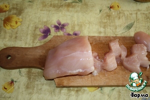Куриное филе разморозить, нарезать на порционные кусочки (2-3 см), подсолить, варим до готовности.