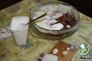 Слой - тушеные овощи. Чеснок режем крупными кусочками и произвольно втыкаем в массу, добавляем пару горошинок черного перца и лаврушку.