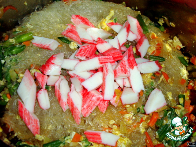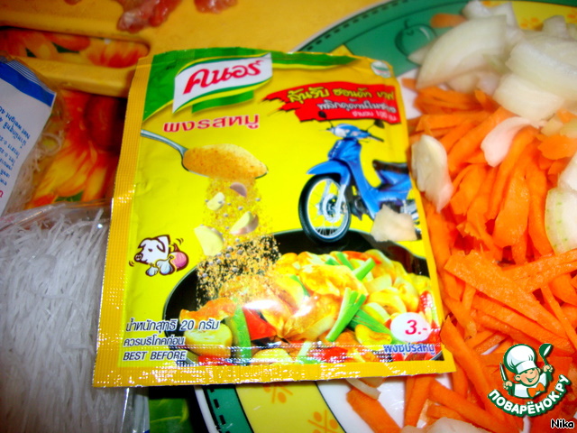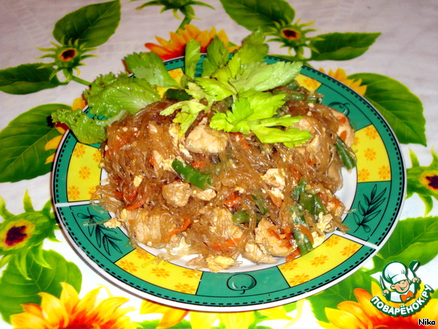 | Лапшу (фунчозу) сын привeз из Таиланда. Он у меня повар в хорошем ресторане, но готовить дома не любит. Иногда у него наступает ностальгия и ему хочется покушать, что - то в тайском варианте. Готовили вместе... получилось очень вкусно. В гостях, друзей он удивляет тайской едой, а дома нахваливает, всe то, что приготовлю я. |