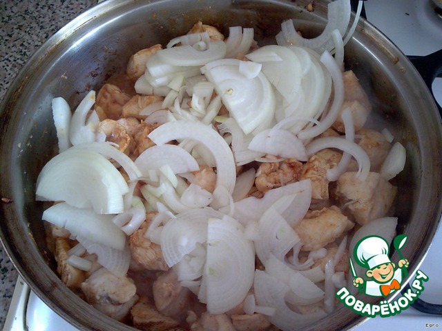 Обжариваем филе на разогретой сковороде. Добавляем нарезанный полукольцами лук.