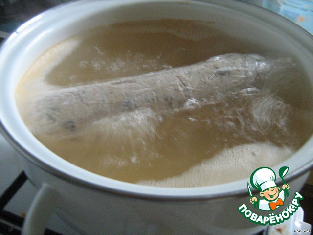 Колбаску опускаем в кипящую под соленую воду,и варим 1 час
