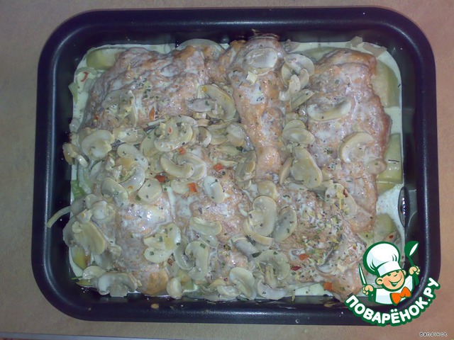 5 Готовим Заливку- сливки смешиваем с майонезом и шампиньонами, добавляем сок от шампиньонов, соль (чтобы было немного пересолено), перец и зелень и заливаем нашу курочку на 2/3