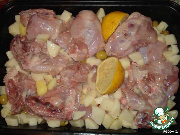 Лимон разрезаем пополам, поливаем соком лимона курицу, а половинки лимона кладем в форму.