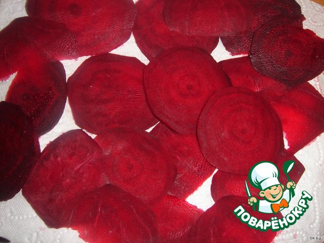 Подготовить свеклу. Одну очень тонко нарезать кружочками, обсушить на бумажном полотенце и отложить.