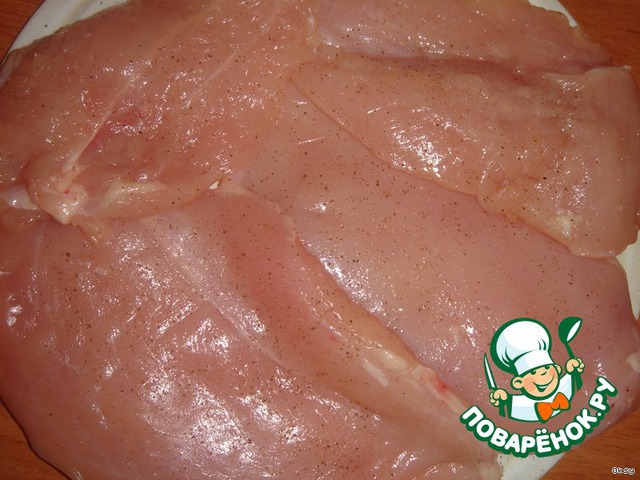 Куриные филе разрезать вдоль, чтобы получились 4 тонких эскалопа. Можно слегка отбить через пленку.