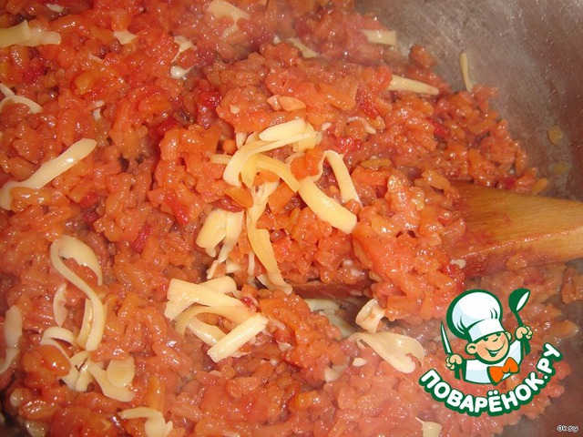 В готовый рис добавить 2/3 натертого на крупной терке сыра. Осторожно перемешать. Рис получается не только необычного цвета, но еще и очень ароматный и вкусный.