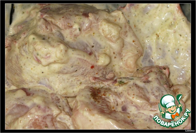 Куриную грудку нарезать на порционные куски. Замариновать на 20-30 минут в смеси из майонеза и овощной приправы "Вегета".