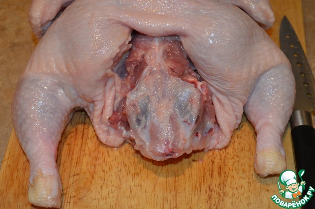 Через место потрошения удаляем кости у курицы. Для этого укладываем ее на грудку и, нажимая на спину, переламываем бедренные кости. Отрезаем лишний жир и гузку. Далее аккуратно, как бы соскабливая, отделяем кости со спинки, вынимаем каркас. Перевернув курицу, проделываем то же самое с грудкой. Косточки голени и крыльев можно оставить, так курочка будет красиво смотреться, и любителям погрызть косточки тоже кое-что останется.
