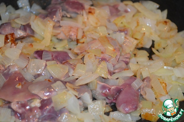 Лук чистим, режем и обжариваем на растительном масле до золотистого цвета, добавляем печень и жарим еще 5 минут, помешивая.
