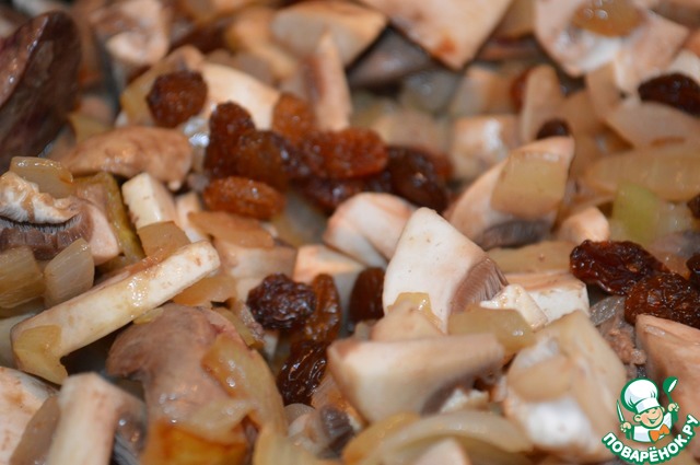 Добавляем грибы и изюм, перемешиваем и готовим еще минут 5-7.