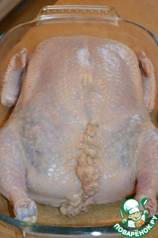 Этой смесью натираем курицу внутри и снаружи, укладываем ее в форму или на блюдо и даем промариноваться, пока будет готовиться начинка.