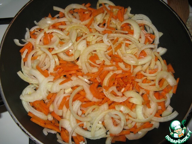 На сковороду влить оливковое масло и обжарить лук и морковь в течении 5 минут.