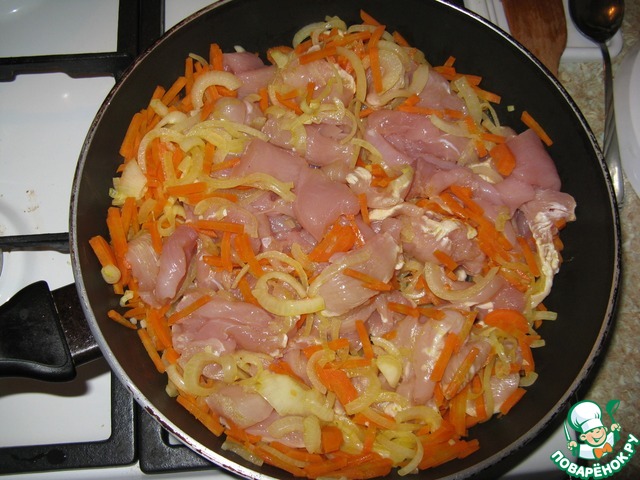 Добавить к луку и моркови кусочки курицы, продолжить обжаривать еще 7-10 минут, изредка помешивая.