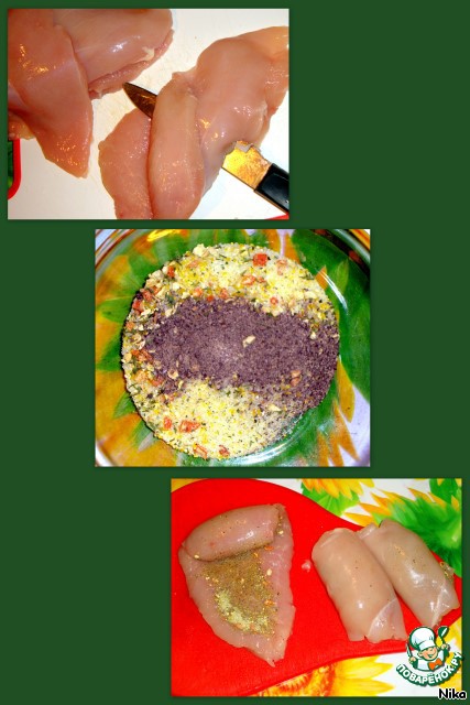 А так я готовила в самый первый раз куриное филе в листьях пекинской капусты. Не мариновала. Филе разрезала на две части вдоль. Обсыпала смесью из приправы и перца.