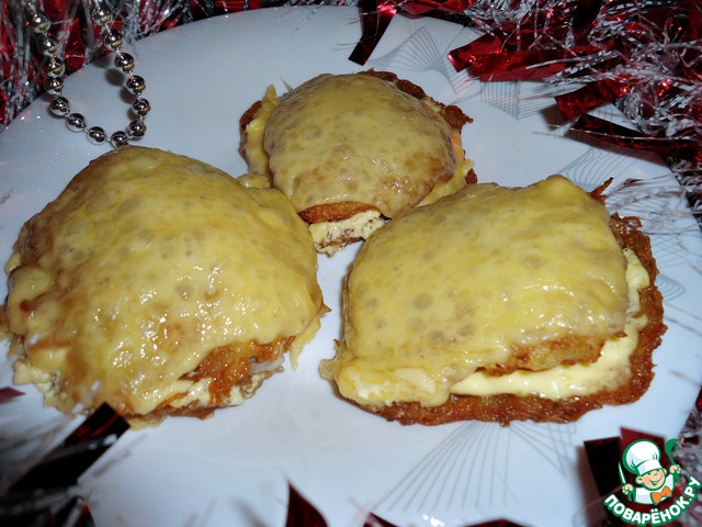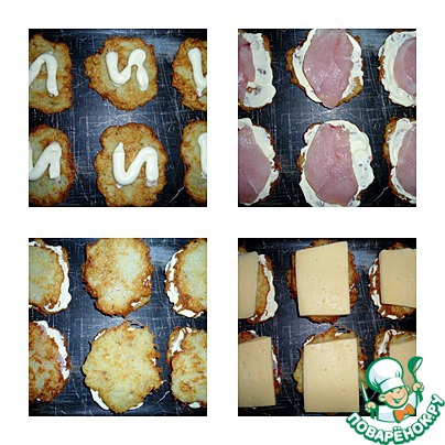 Выкладываем на противень или в форму драники (у меня получилось 18 штук, соответственно в итоге 9 "шубок"), смазываем майонезом, кладем кусочек куриного филе, затем закрываем драником и наверх ломтик сыра. Советую на сыр не скупиться, кусочек, да потолще=)