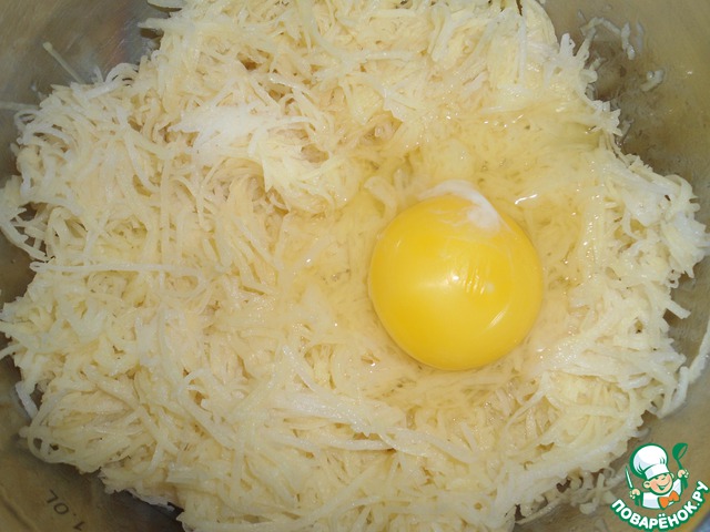 Натереть на терке, добавить яйцо, мелко нарезанный лук, муку, соль и перец, перемешать.