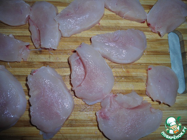 Куриную грудку режем поперек волокон, шириной примерно около одного сантиметра. Присаливаем.