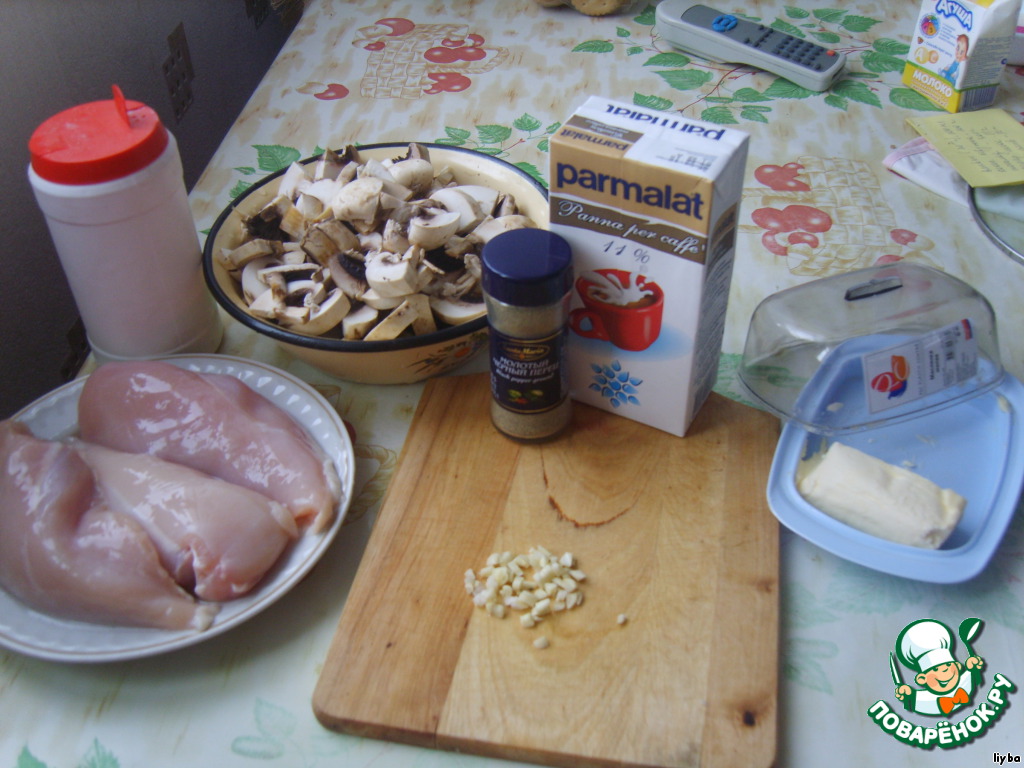 Чеснок мелко нарезать, нарезать грибы дольками. В сковороду, где обжаривалась курица, добавить немного сливочного масла. Обжарить немного чеснок (измельчeнный), затем к нему добавить грибы. Обжарить при помешивании до полного испарения сока. Туда добавить ложку муки и обжаривать ещe минуту.