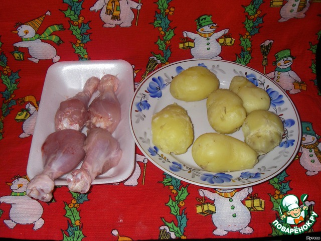 Очистить картофель от шкурки, а куриные ножки от кожи.