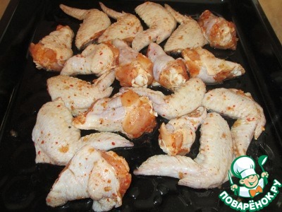 Выкладываем крылья на противень и отправляем в разогретую до 200 градусов духовку на 20-25 минут