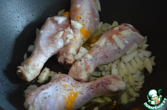 В это время на оливковом масле обжариваем мелко нарезанный лук, курицу, куркуму и перец. Постоянно помешиваем. Обжариваем в течение 10 мин.