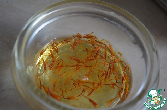 Шафран залить горячей водой (примерно 2-3 ст. л.) и поставить настаиваться.