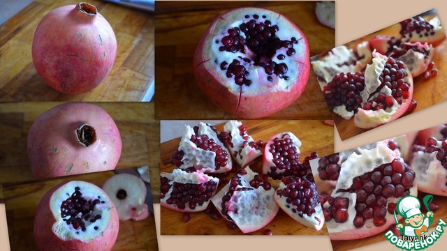 Берем очень красивый гранат. Аккуратно срезаем у него верхушечку, вырезая немного еще и белую серединку. То же самое проделываем с донцем. После этого делаем насечки по вертикалям граната. Аккуратно тянем за две стороны. И вот мы красиво раскрыли наш гранат, не повредив при этом ни семечки. Если хотите взять немного сока из граната, просто сожмите кусочек в кулачке над ситом, весь сок вместе с семечками мгновенно выйдет наружу. Семечки же задержатся в сите. Очень просто и очень вкусно...