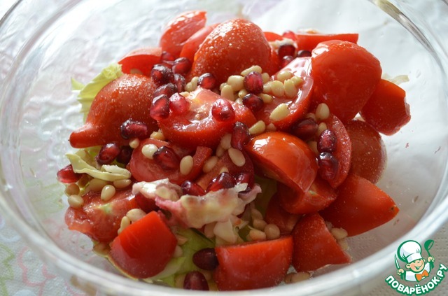 А подавать наш плов к столу мы будем с отменным салатом из помидоров и кедровых орешков. Взять сладкие и красивые помидоры (80-100 г), порубить на крупные кусочки.
