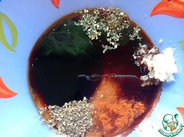 Смешать все специи, чеснок пропустить через пресс. Хорошо все перемешать
